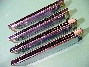 Similar to the 10 hole harmonica, the tremolo harmonica is a "diatonic" instrument, meaning that it is tuned to one key. So, to play in the key of C you use a tremolo in C, to play in G you use a tremolo in G and so on. Tremolo harmonica players carry several instruments, each tuned to different keys, like the photo below.