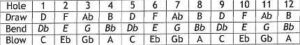 Here is the Diminished layout on a 12 hole diatonic, with the bent notes included: