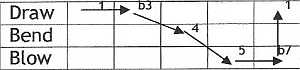 The tough thing with learning an alternate tuning is mastering the new breath and bending patterns. PHRASE MAPS can help speed the process, because they give clear visual reinforcement to what’s happening with the harp in your mouth. They simply involve making lines between cells in a tuning table, to indicate the path your mouth takes and the breath changes and bends involved.