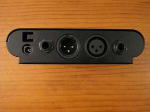 This photo shows the preamp connections. The small hole is for the power supply. There are two input connectors, so that you can use either a microphone lead or a guitar lead. There are also two output connectors.