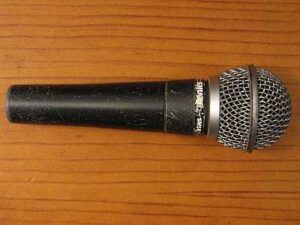 The microphone is a Shure SM58 (shown here), a common vocal microphone, often used by harmonica players.